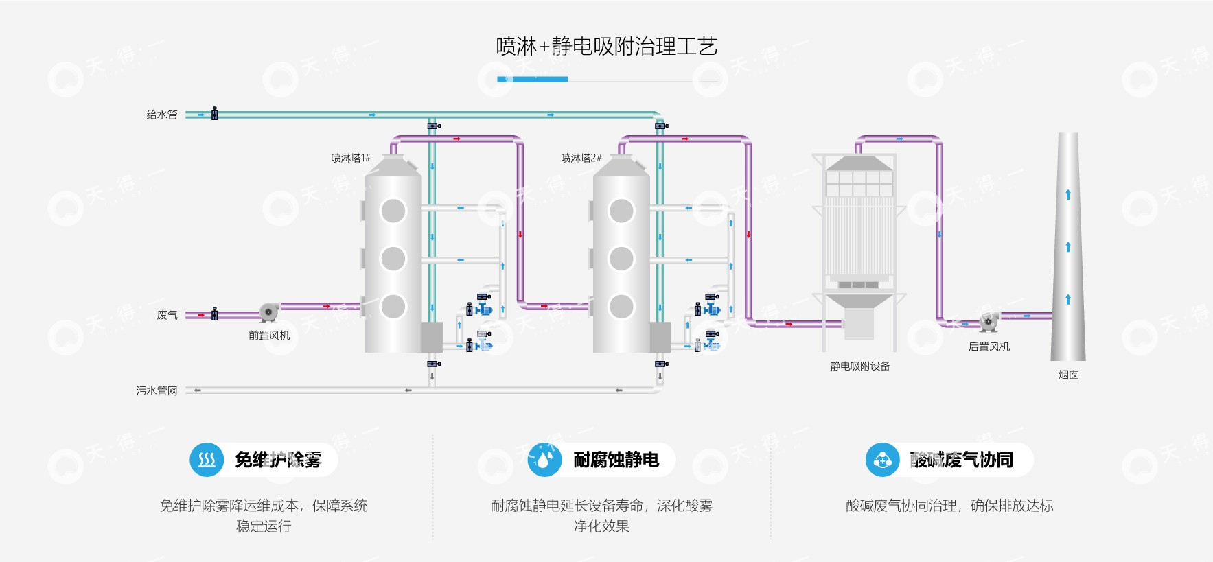 针对PCB内层蚀刻中真空二流体设备产生的HCl酸雾“飘白”问题,天得一采用 “喷淋+静电吸附” 双级治理工艺,喷淋实现酸雾中和吸附深度净化残留酸雾气溶胶,保证净化效率≥98%。