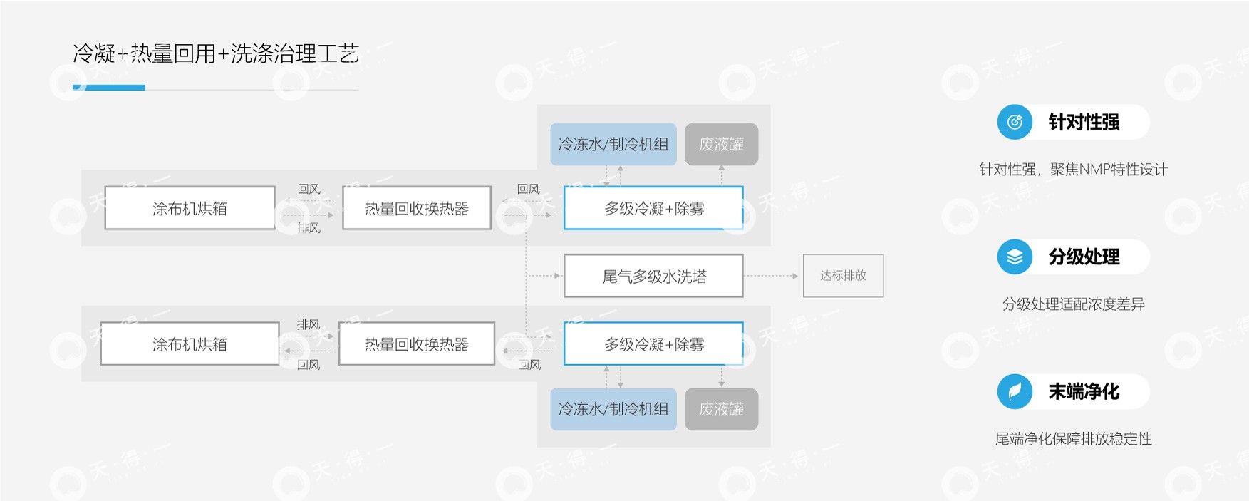 我司采用“热量回用 + 冷凝 (+吸附脱附冷凝)+ 高塔吸收/活性炭吸附”组合工艺进行高效处理与资源回收,涂布机排出的废气首先经过换热器,将热量传递给回用尾气,随后进入二级梯度冷凝系统,可实现90%以上NMP的冷凝回收。净化后的尾气中90%–95%部分经换热升温后,返回涂布烘干系统循环使用,形成闭路循环与热能回用,兼顾节能与低碳运行,对于回用气体洁净度要求更高的工况,系统可升级增设吸附脱附+冷凝单元,进一步降低回用废气中NMP浓度。